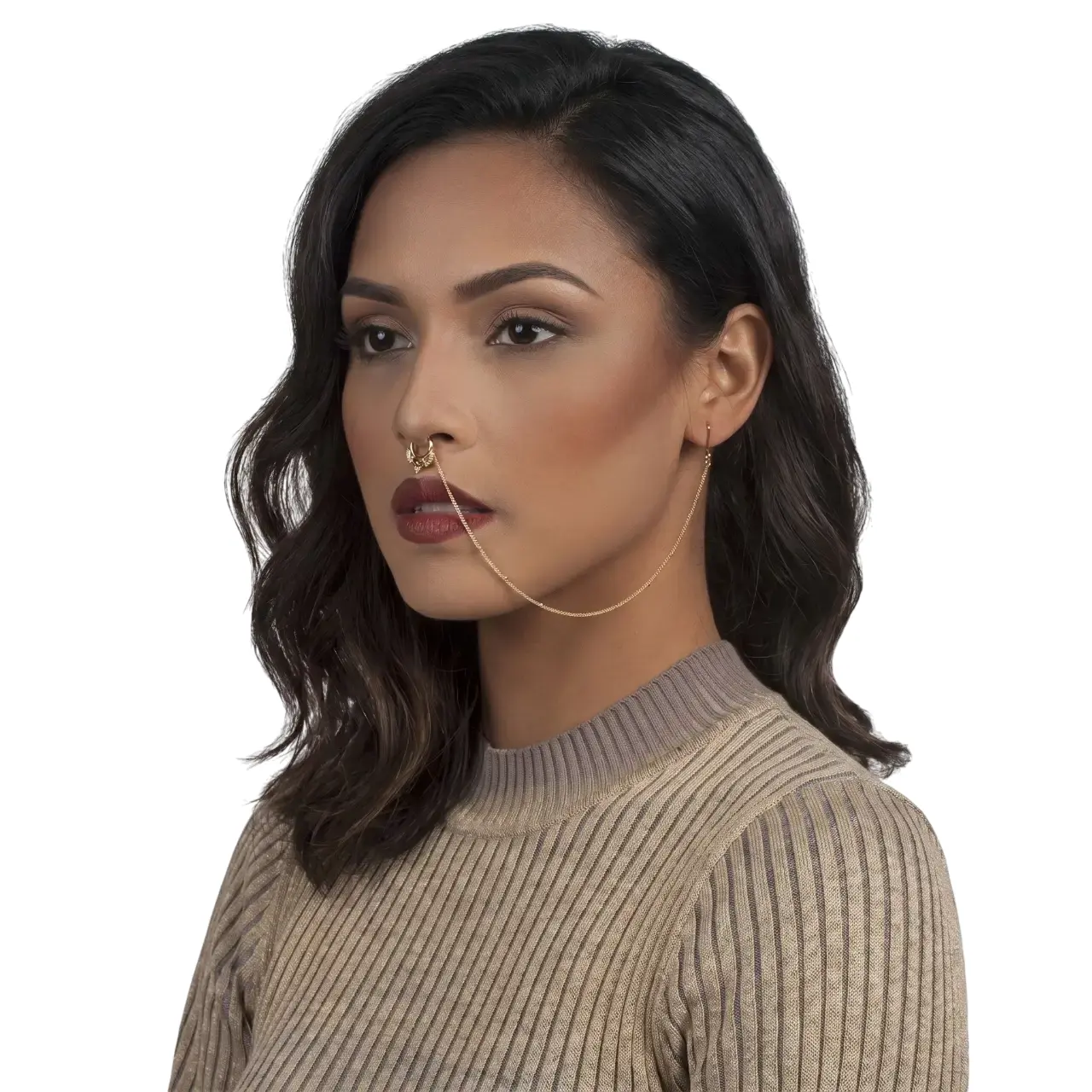 • Burun ile kulak arasında uzanan zincir detayı, yüzünüze dikkat çekici zarif bir ifade katar.